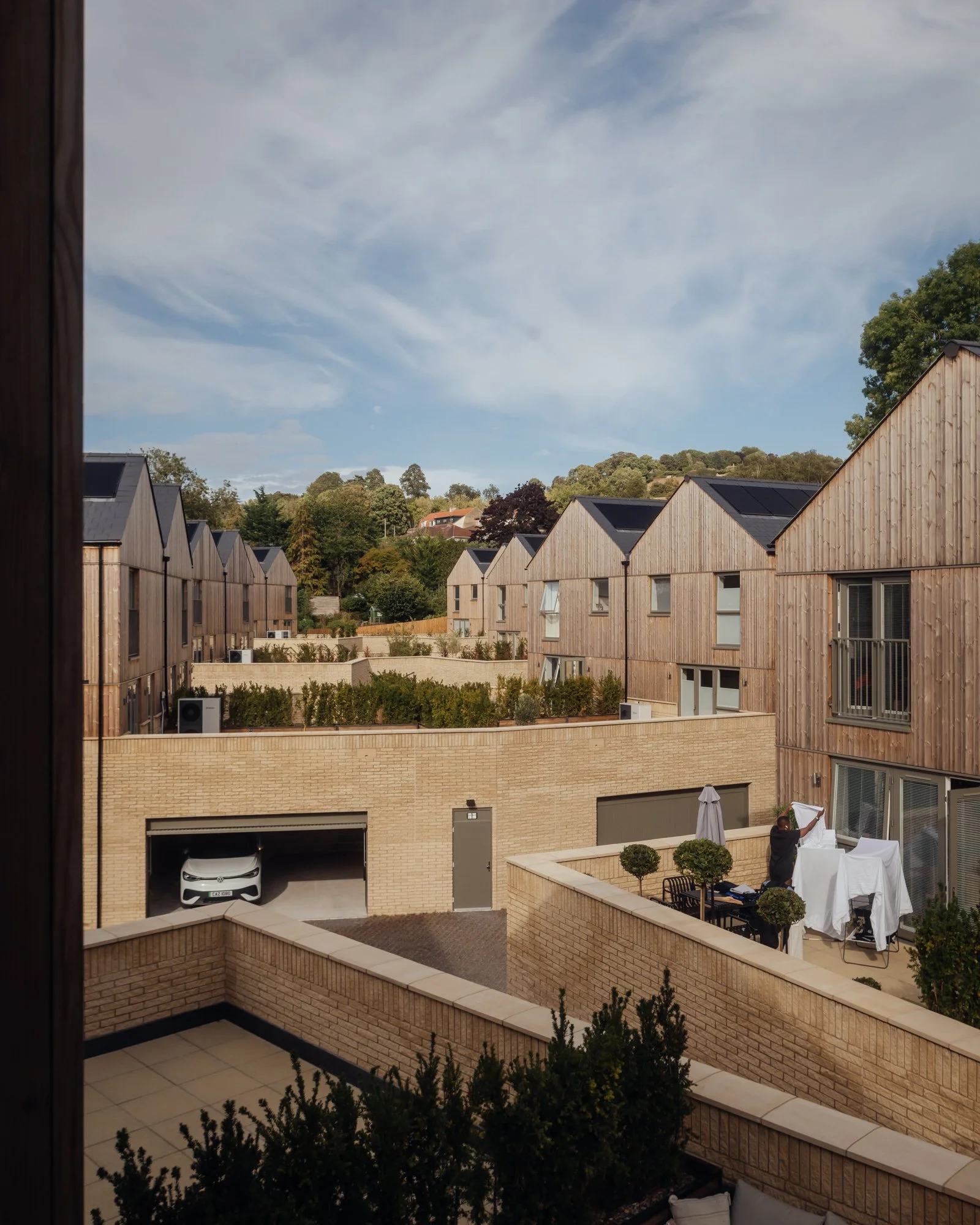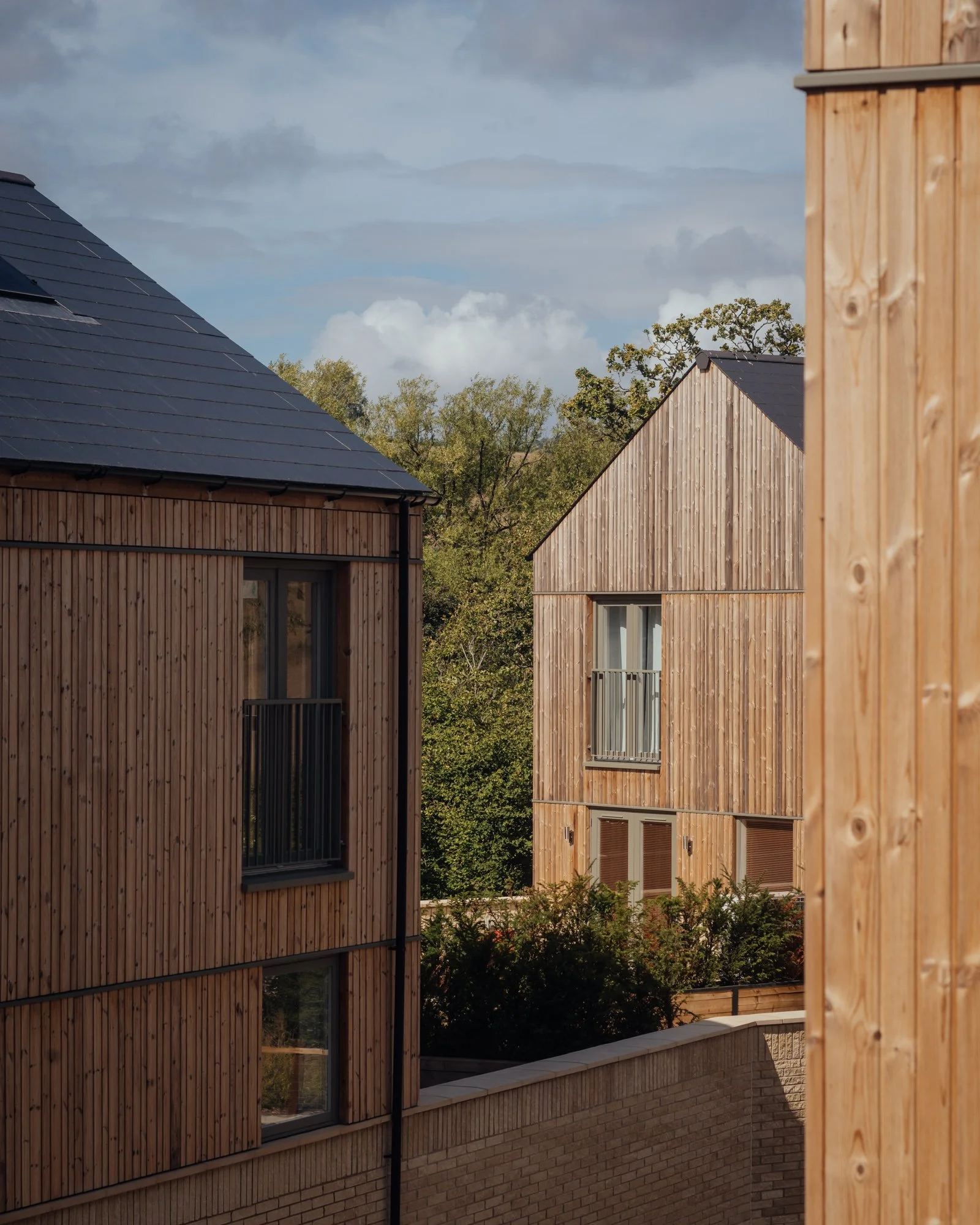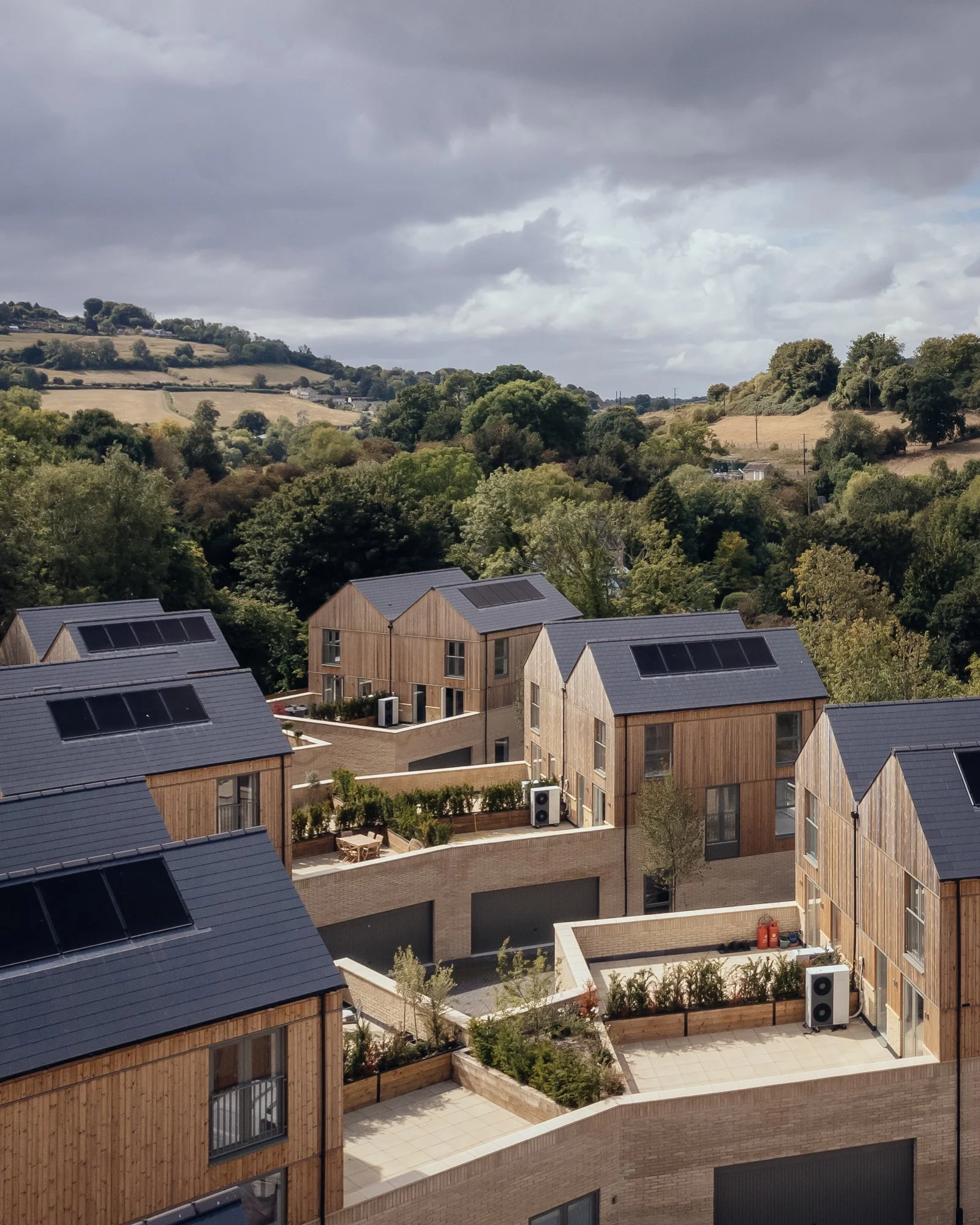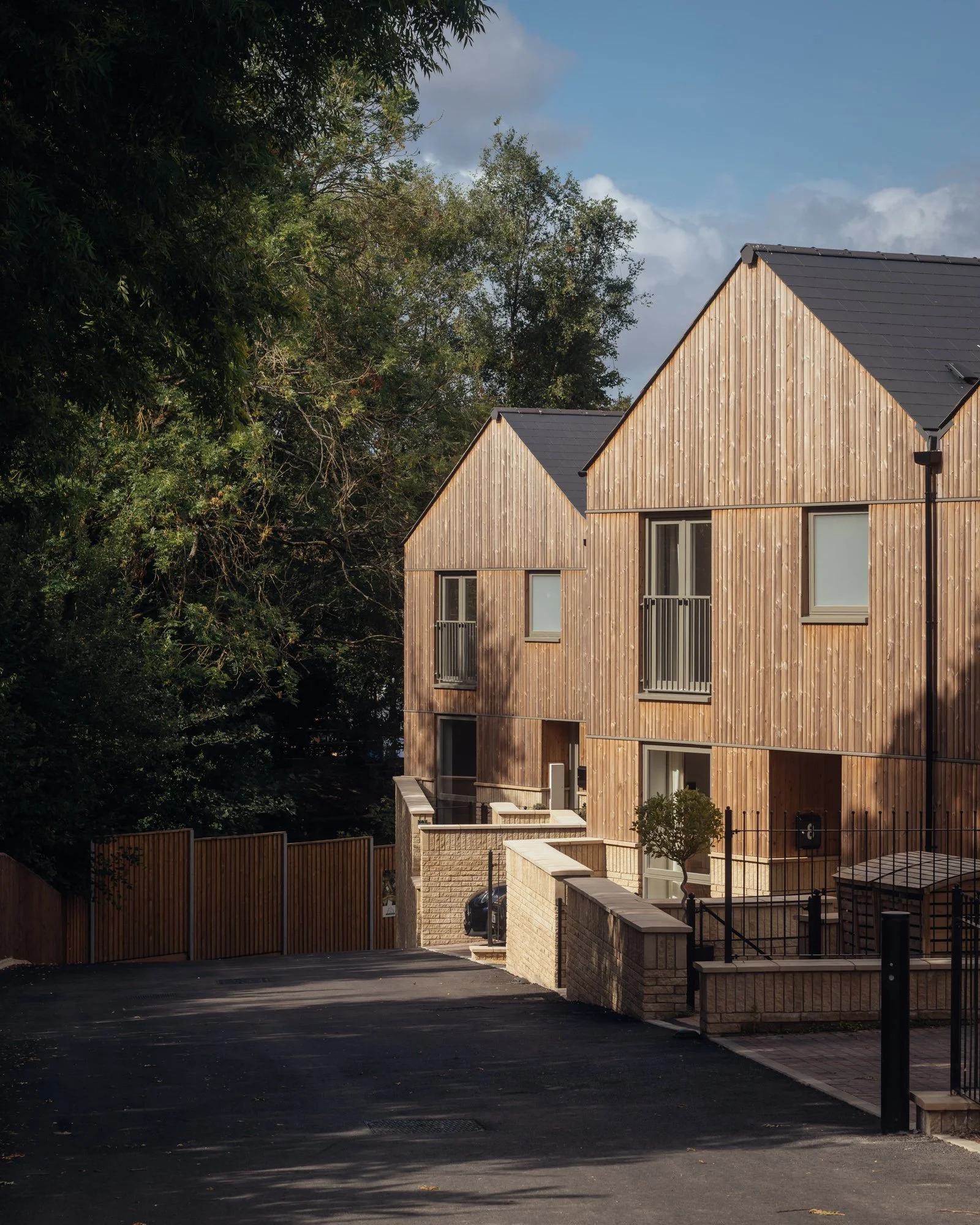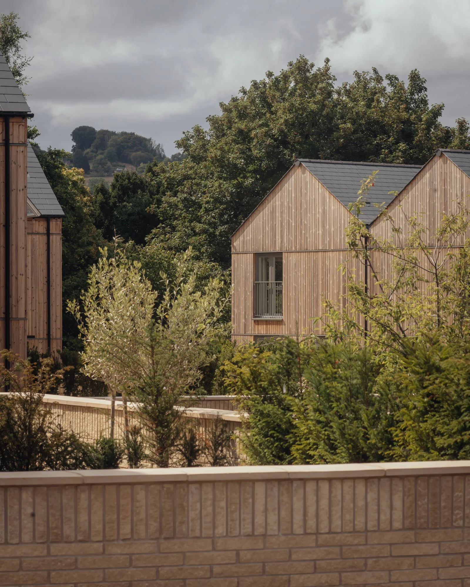 The design draws from Box’s distinctive topography: houses step gently with the terrain, accessed at two distinct levels, with views framed by mature trees and the sound of water from the old mill gate always present. A network of shared green spaces weaves between the homes, encouraging moments of connection, play, and quiet reflection.