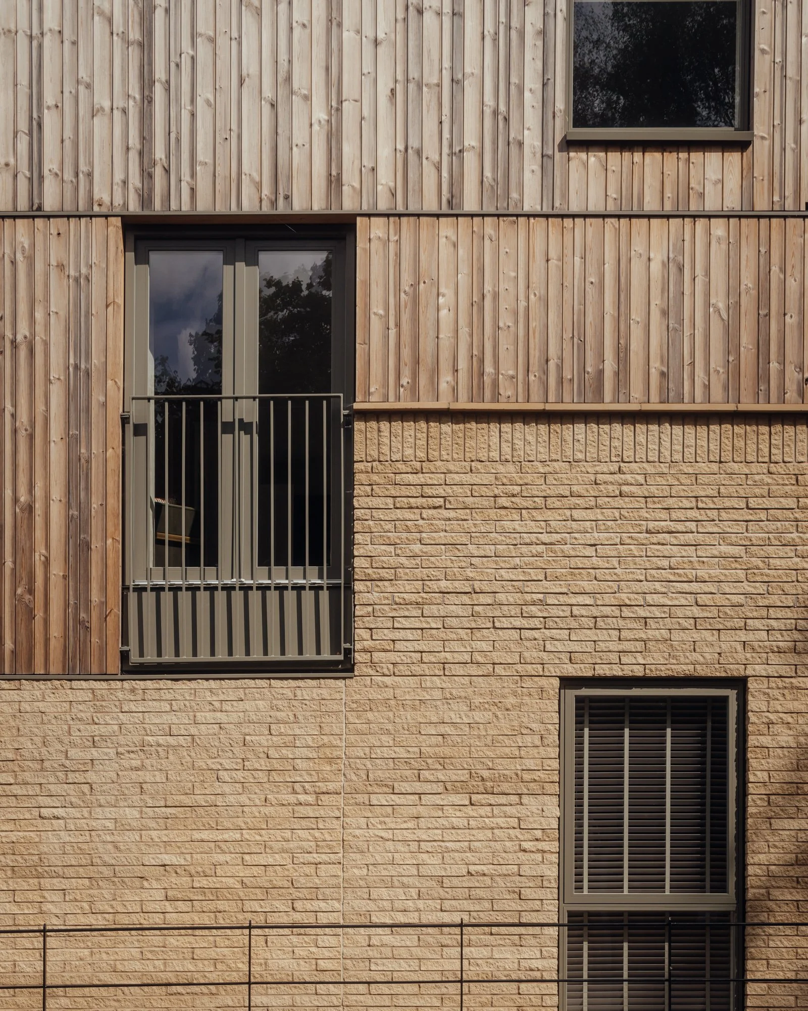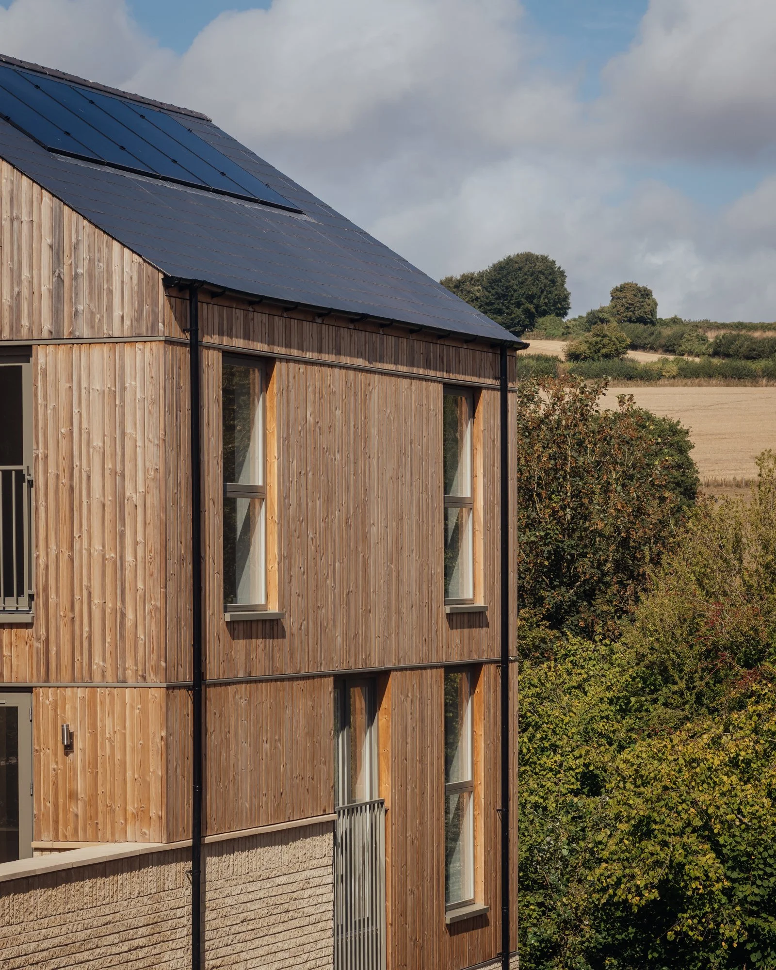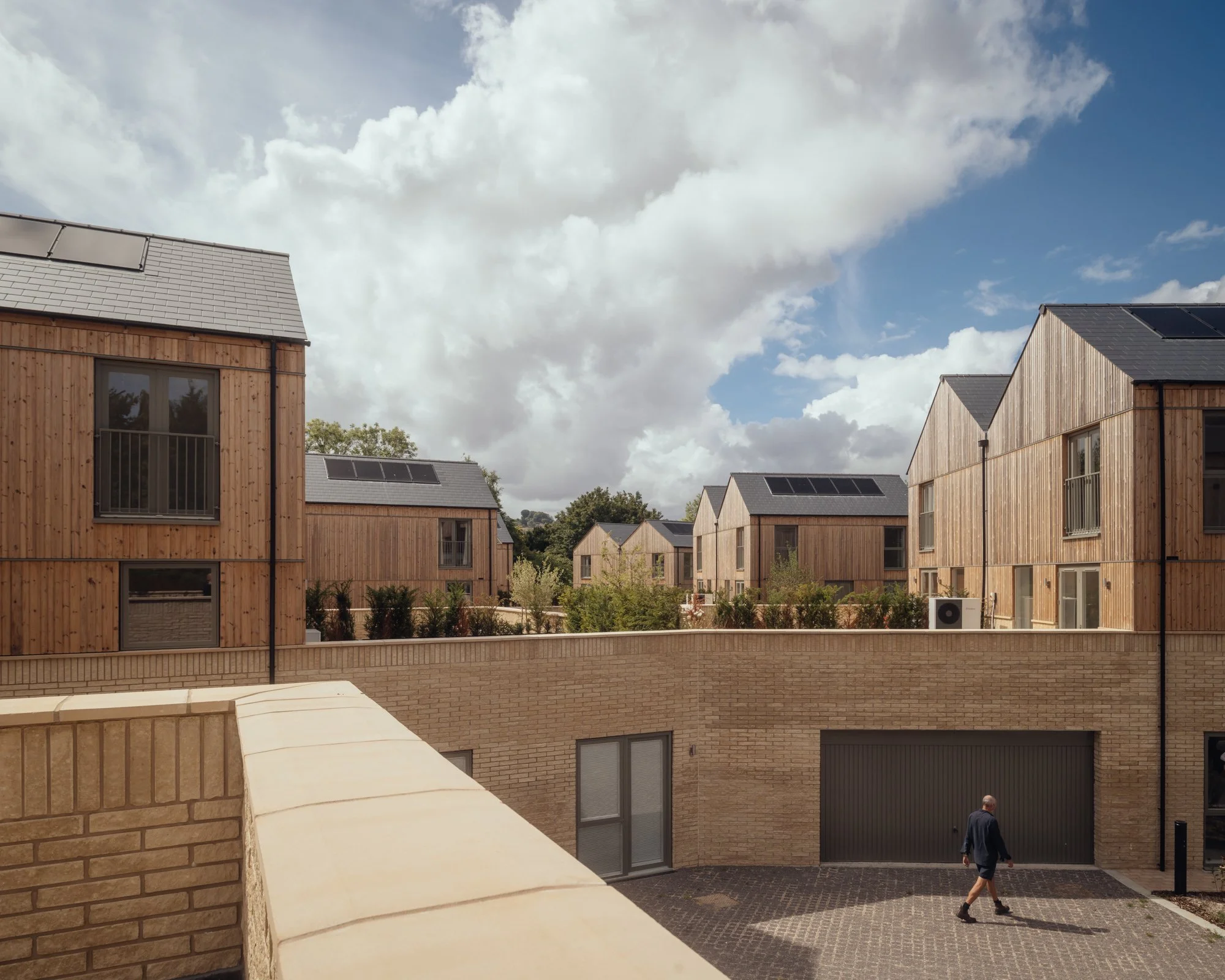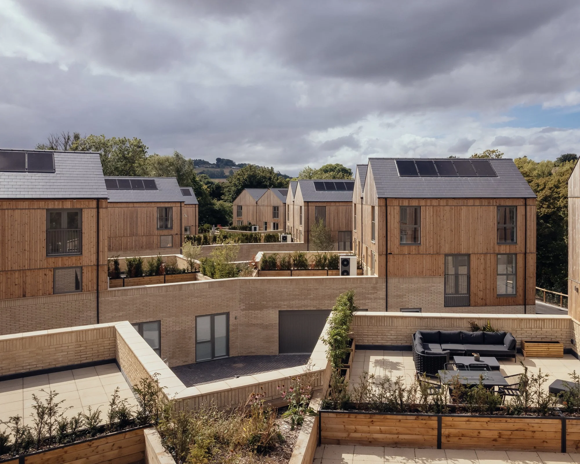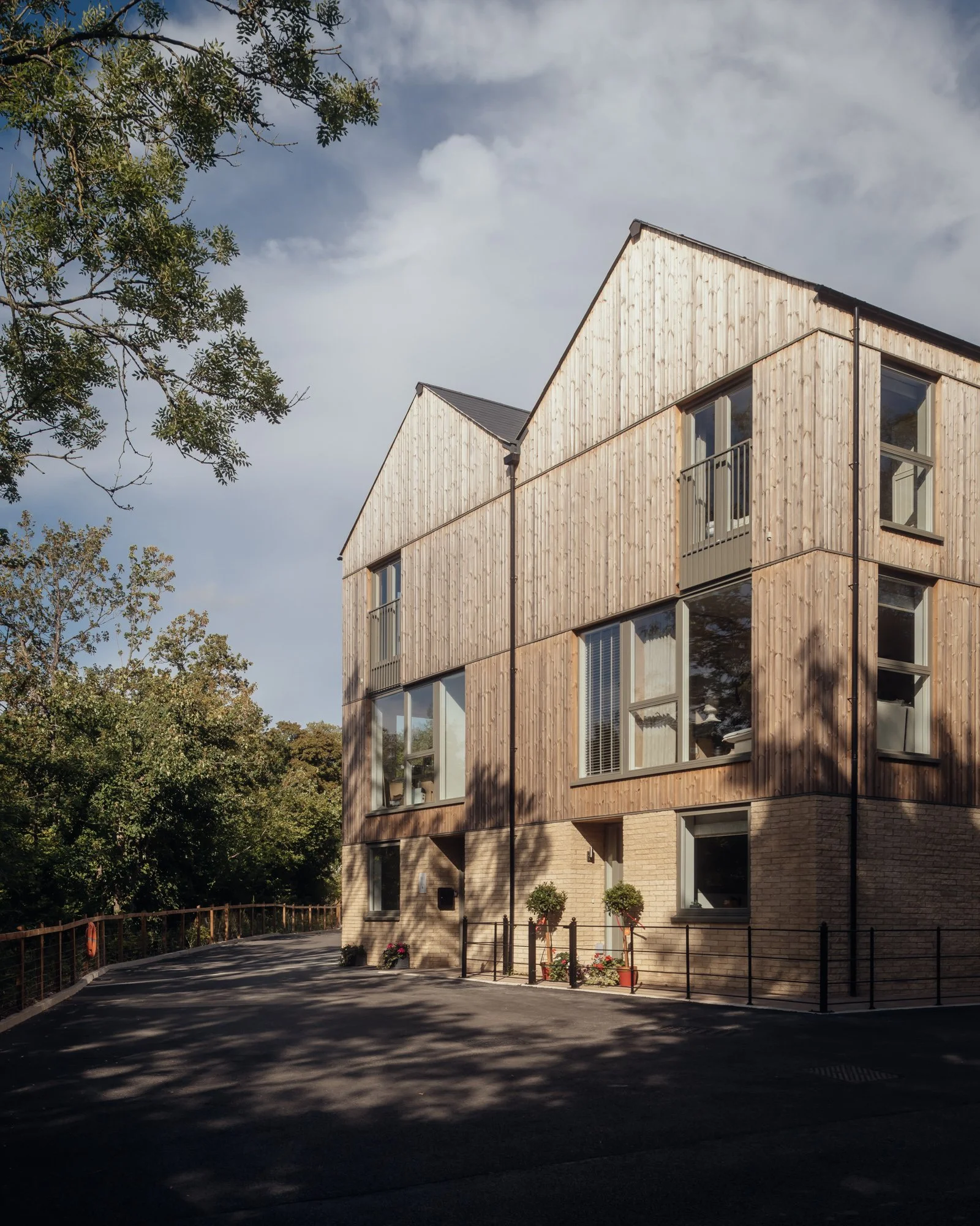 The design draws from Box’s distinctive topography: houses step gently with the terrain, accessed at two distinct levels, with views framed by mature trees and the sound of water from the old mill gate always present. A network of shared green spaces weaves between the homes, encouraging moments of connection, play, and quiet reflection.